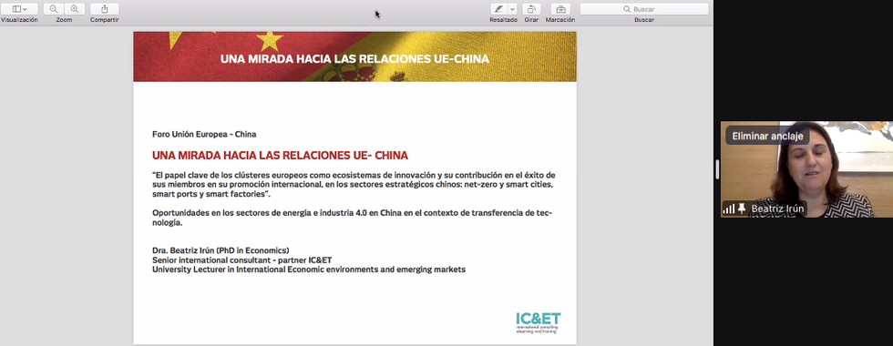 Por otra parte, la siguiente jornada que tuvo lugar el 5 de mayo de 18:00h a 20:00h se siguió con las exposiciones de otro grupo de ponentes en el que Fidel Mateos también actuó como moderador y expuso, al final de la jornada, unas breves conclusiones de ambas jornadas. En este caso, el grupo estuvo conformado por Felipe Debasa, de la Universidad Rey Juan Carlos y del Máster UE- China; Gloria Claudio Quiroga, profesora de la Universidad Francisco de Vitoria y Doctora en Economía; Javier Serra, Director General de Internacionalización del ICEX; Beatriz Irún, Doctora en economía, consultora internacional, Profesora Asociada Universidad Jaume I y profesora ESIC Valencia y Mar Perona Alfageme, Doctora en Ciencias Económicas por la UCM y profesora de universidad.